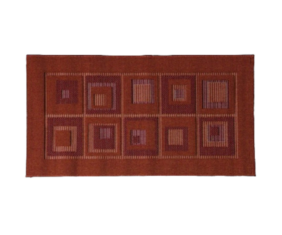Machine made carpet in deep red shade with a distinctive design of contrasting curves. It is synthetic with an embossed surface that makes it highly resistant to stains and easy to clean.