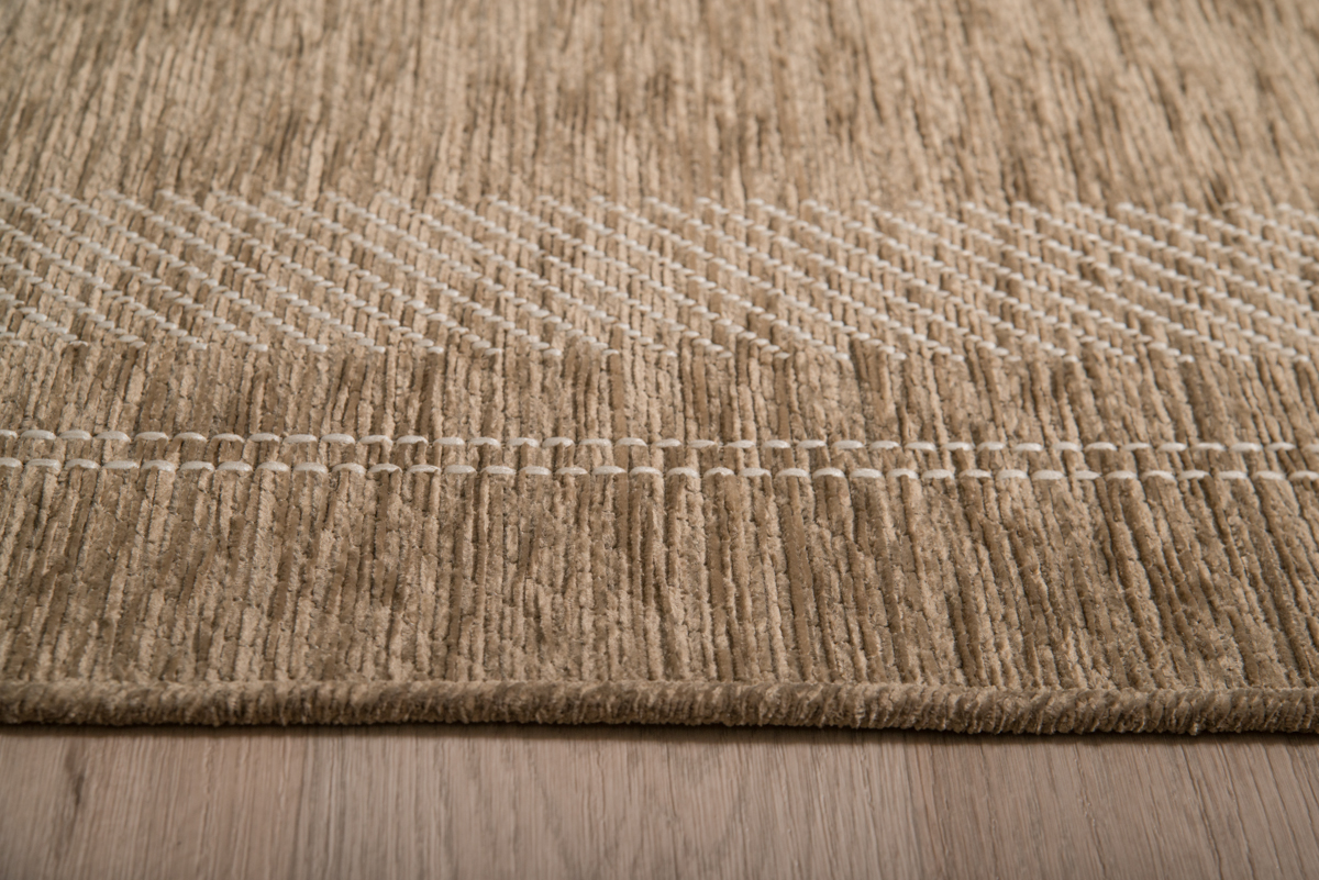 Modern machine made carpet in a beige shade with a very soft texture and a discreet design with irregular lines. It has Chenille upholstery on its surface, it is synthetic and fits in any area of the house.