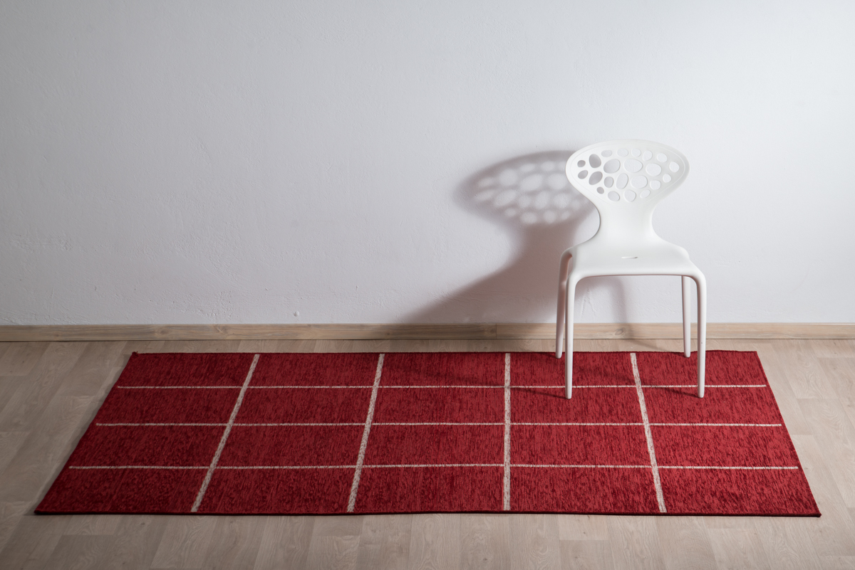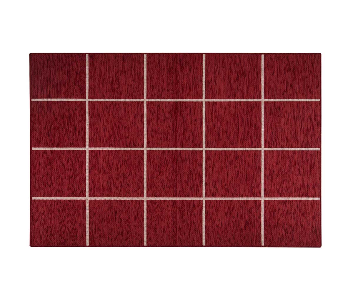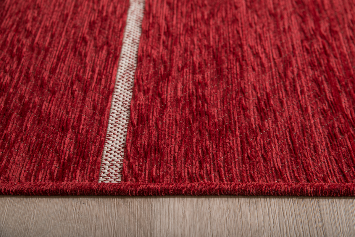 Modern machine made carpet in a bordeaux shade with a very soft texture and a discreet design with irregular lines. It has Chenille upholstery on its surface, it is synthetic and fits in any area of the house.