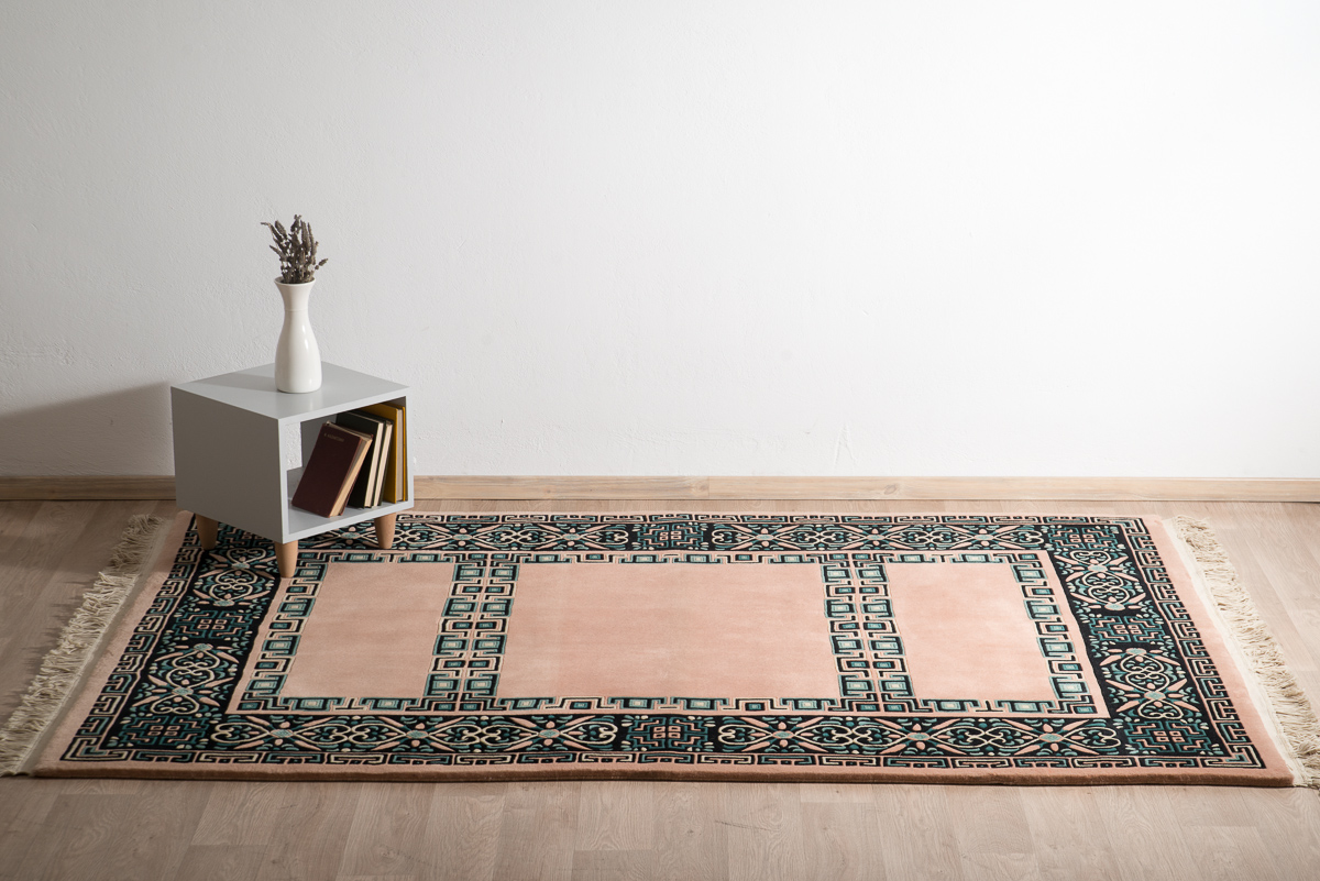 Ολόμαλλο χειροποίητο κλασικό χαλί σε σομόν βάση με σχέδιο σε φυστικί αποχρώσεις.