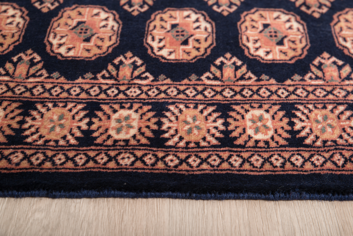 Ολόμαλλο χειροποίητο χαλί διάδρομος, σε σκούρα μπλε βάση και εντυπωσιακό κλασικό σχέδιο σε γήινες αποχρώσεις.