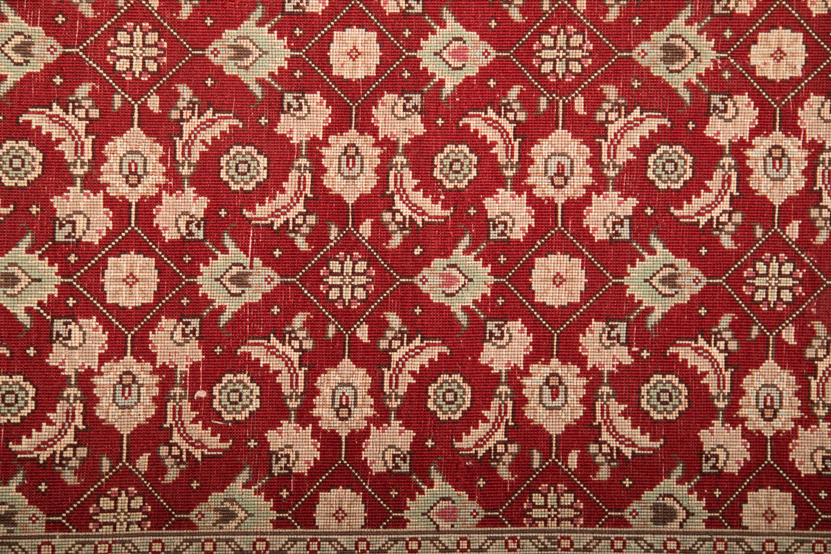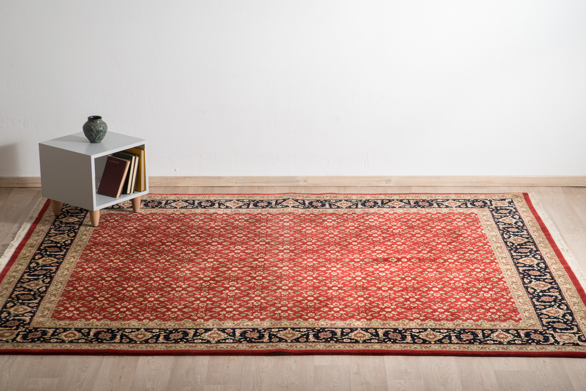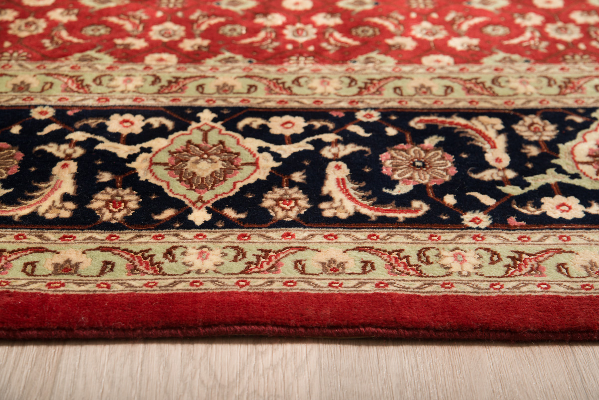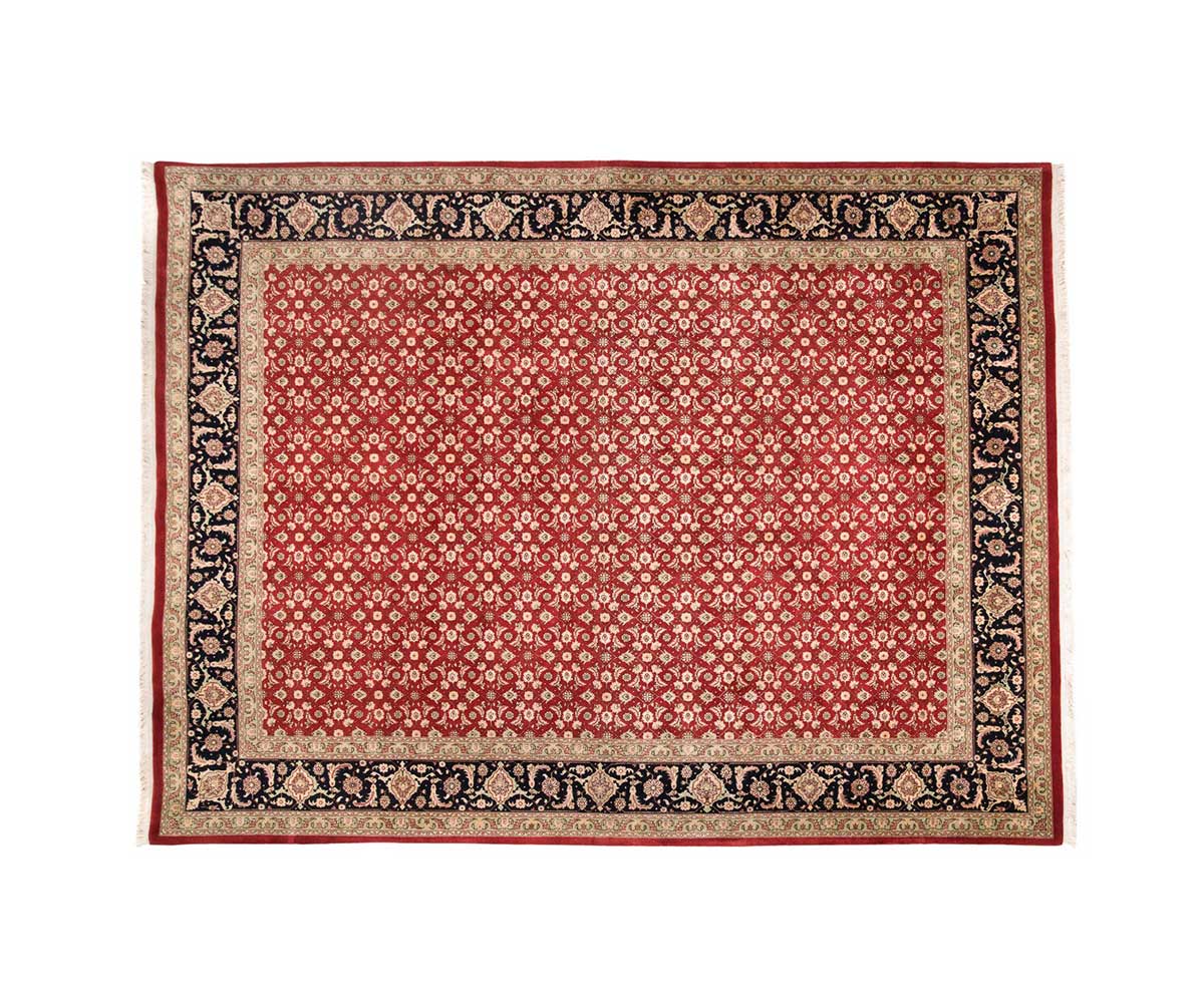 Χειροποίητο περσικό χαλί Tabriz Herati με ιδιαίτερα πυκνή σύνθεση από μαλλί και μετάξι. Έχει σχέδιο με κόκκινη βάση και μπλε σκούρα εντυπωσιακή μπορντούρα.