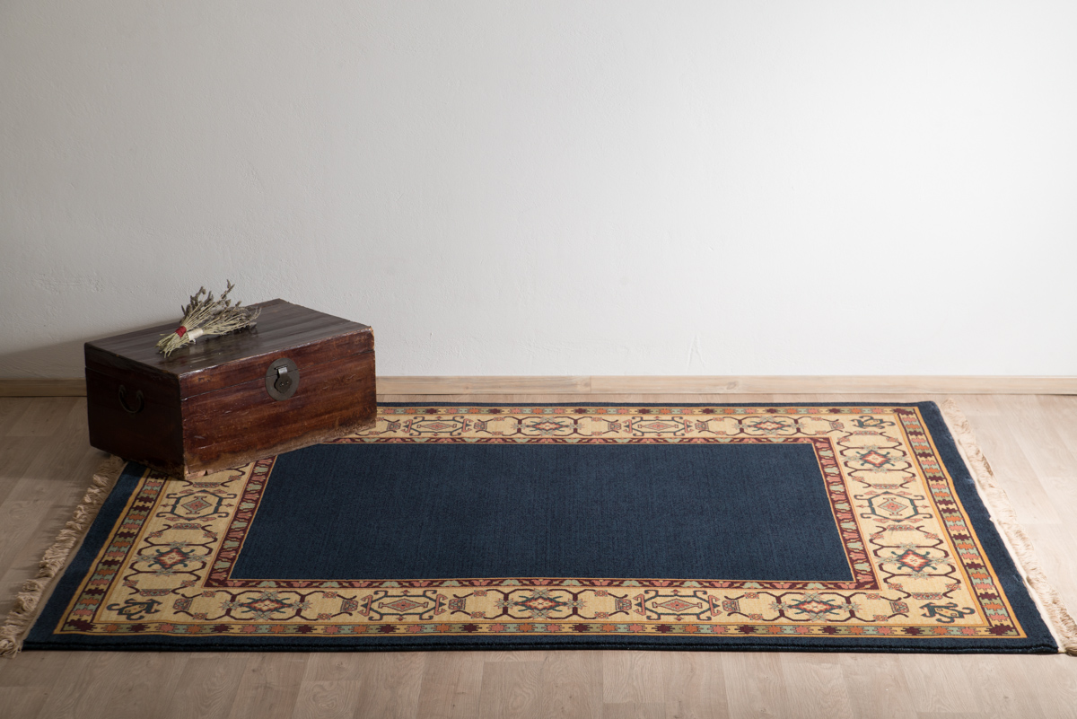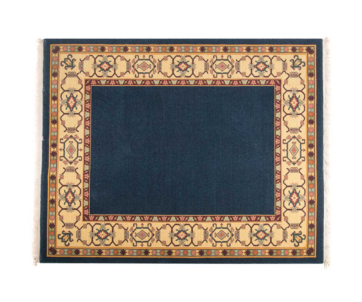Ολόμαλλο χαλί μηχανής σε κλασικό σχέδιο. Ιδιαίτερα πυκνή ύφανση. Μονόχρωμη, μπλε βάση με χρυσαφί μπορντούρα.