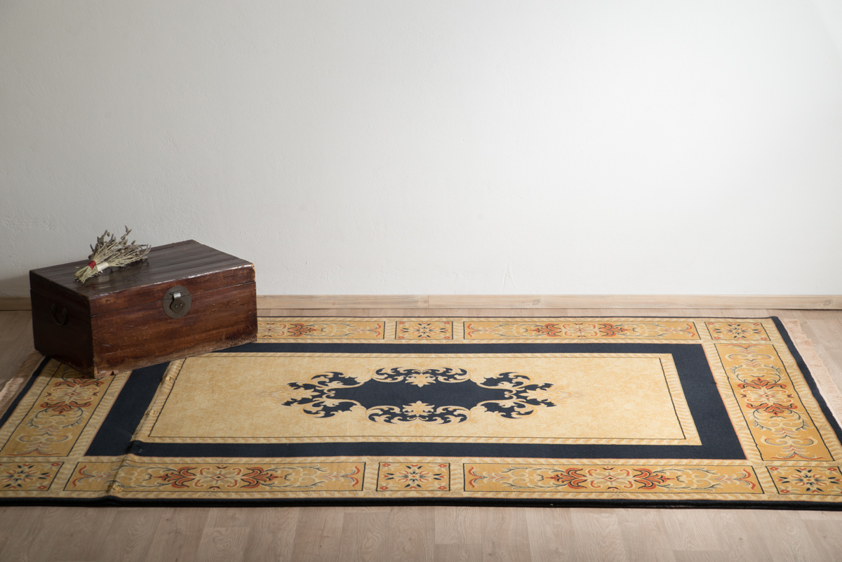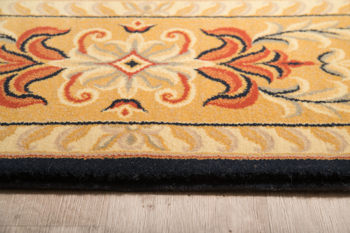 Ολόμαλλο χαλί μηχανής σε κλασικό σχέδιο. Ιδιαίτερα πυκνή ύφανση. Διαθέτει σχέδιο στο κέντρο και χρυσαφί μπορντούρα.