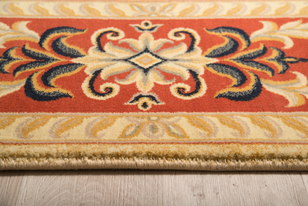Ολόμαλλο χαλί μηχανής σε κλασικό σχέδιο. Ιδιαίτερα πυκνή ύφανση. Διαθέτει χρυσαφί κέντρο και βάση με κόκκινες λεπτομέρειές στην μπορντούρα.