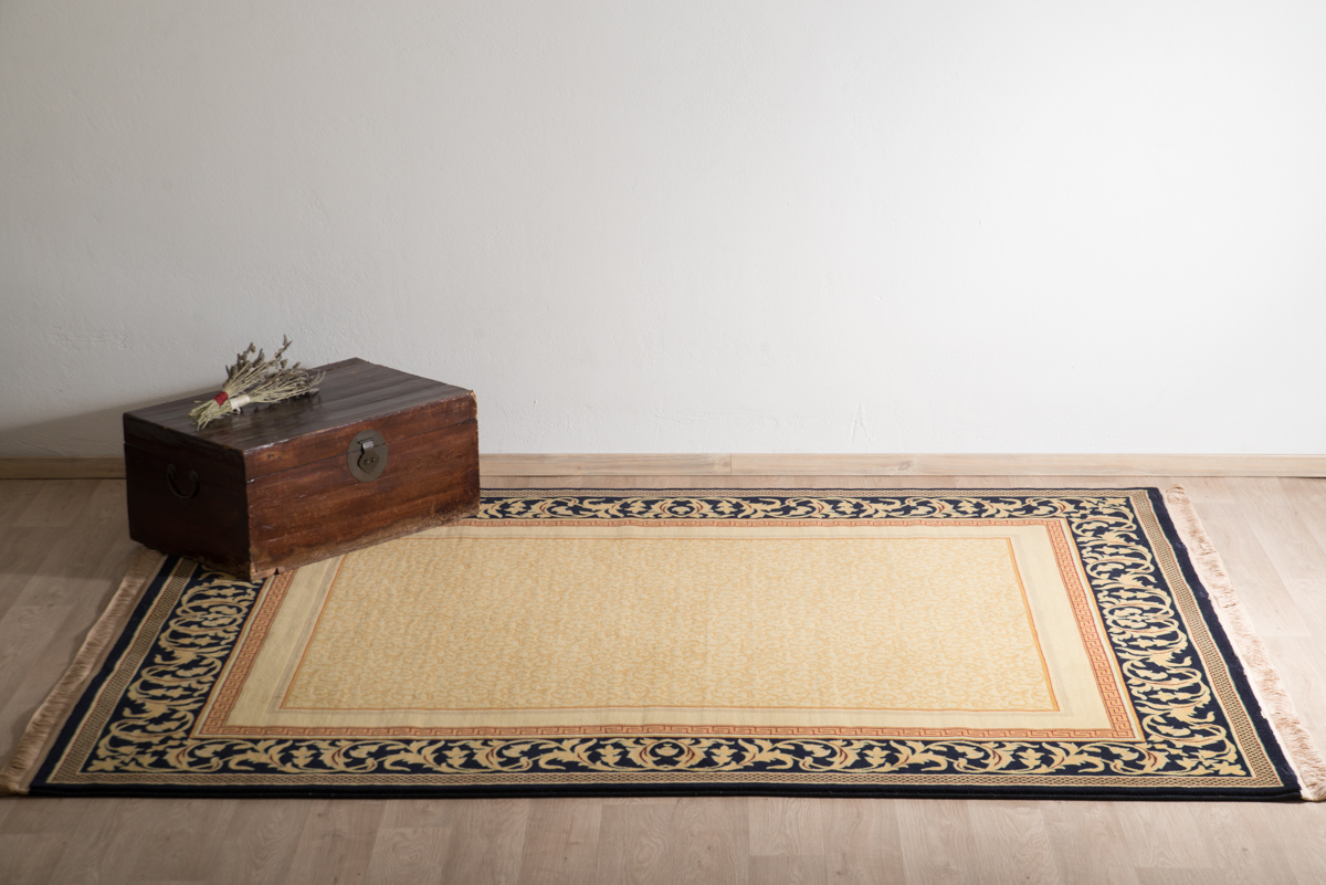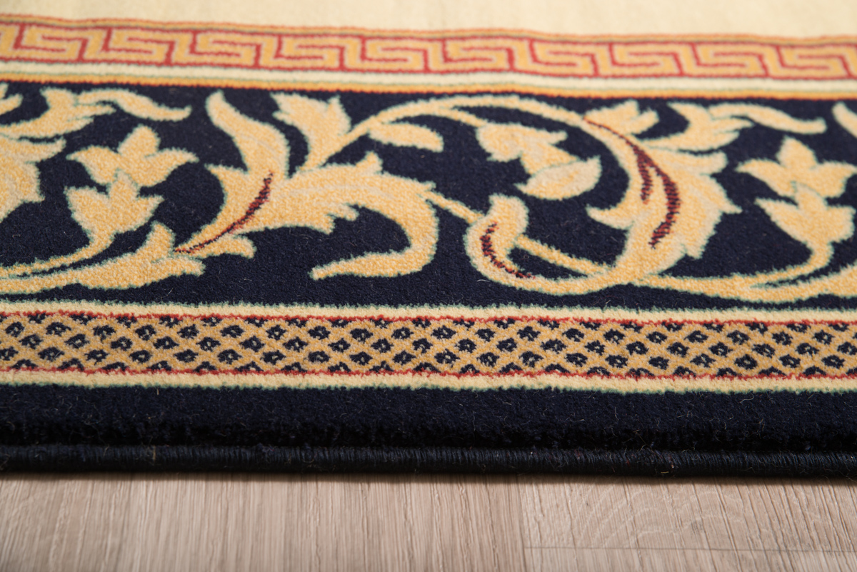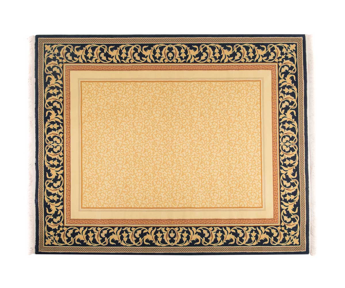 Ολόμαλλο χαλί μηχανής σε κλασικό σχέδιο. Ιδιαίτερα πυκνή ύφανση. Διαθέτει ανοιχτό σχέδιο στο κέντρο και μπλε μπορντούρα.
