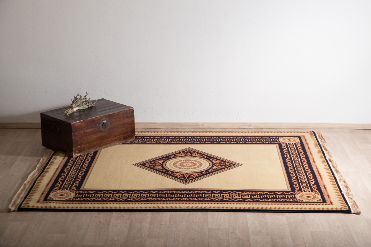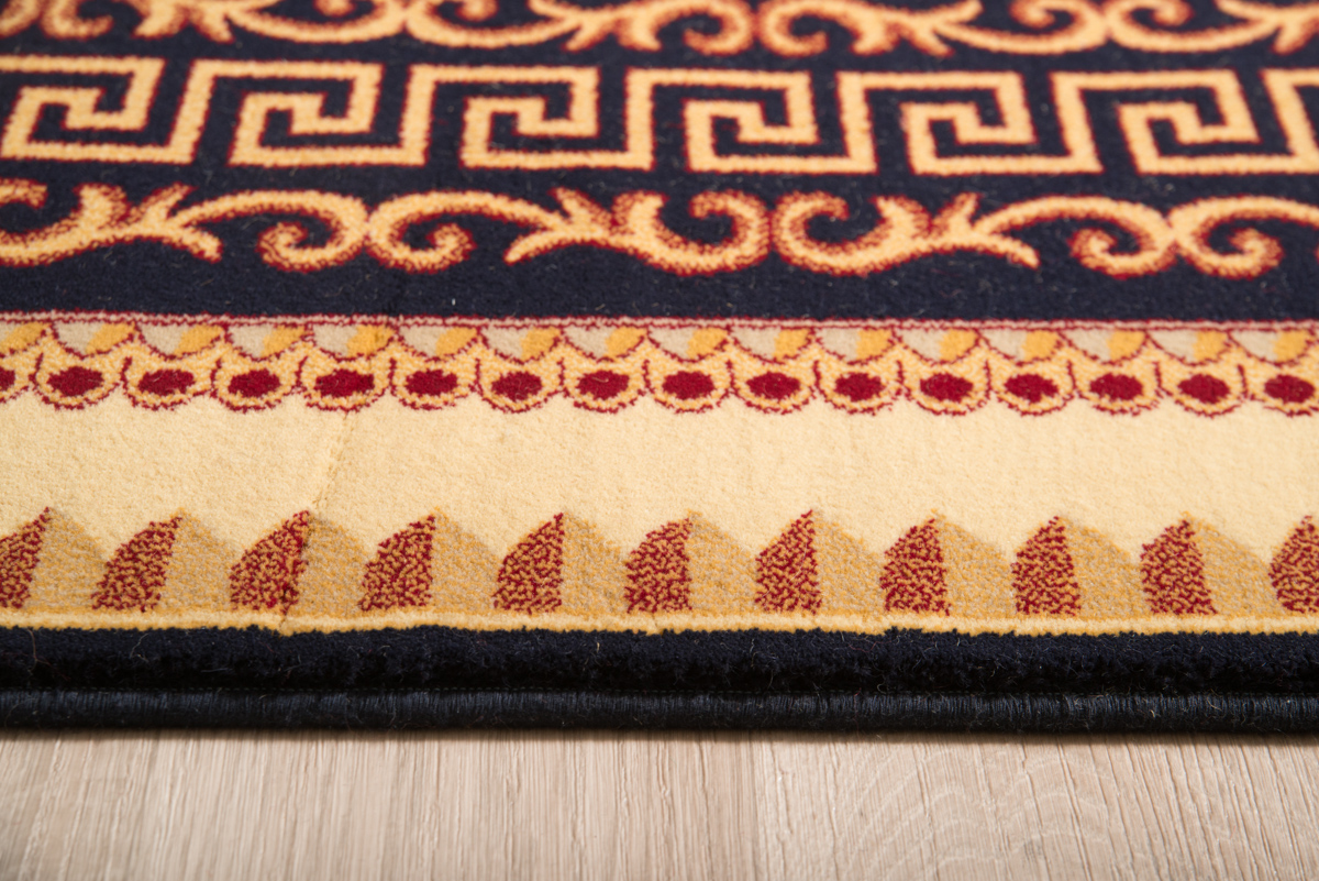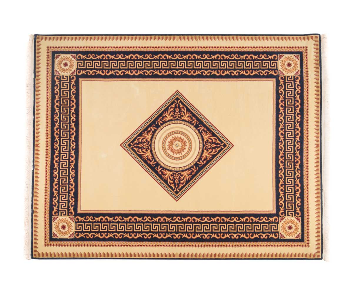 Ολόμαλλο χαλί μηχανής σε κλασικό σχέδιο. Ιδιαίτερα πυκνή ύφανση. Διαθέτει σχέδιο στο κέντρο και χρυσαφί φόντο.