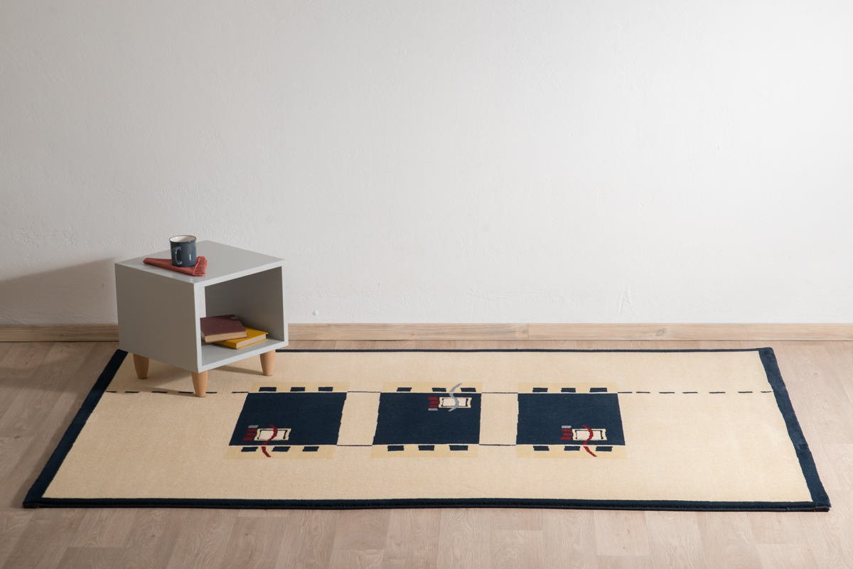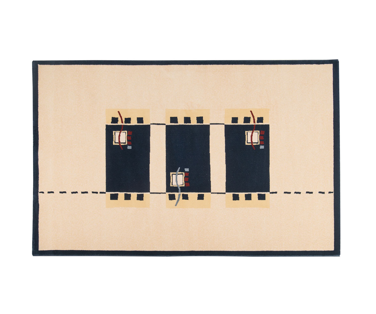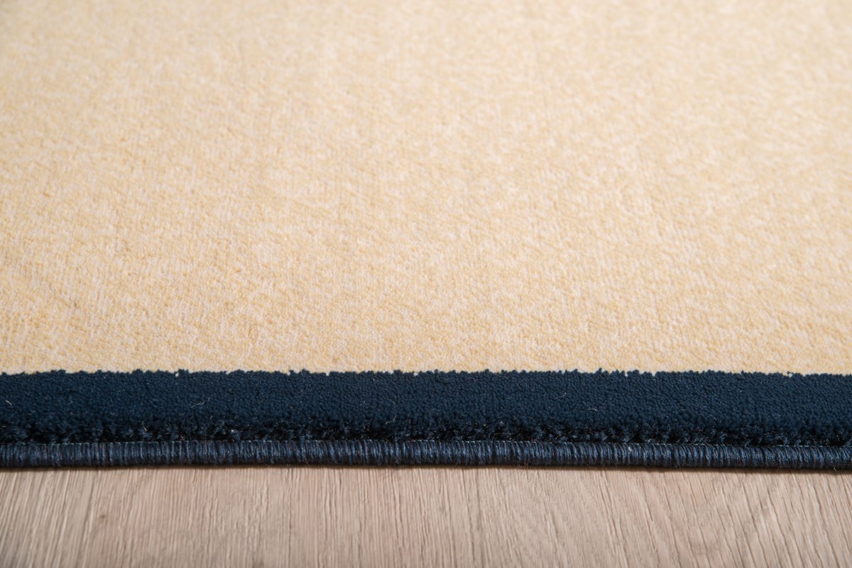 Χαλί μηχανής σε μπεζ βάση με μπλε μπορντούρα και γεωμετρικό χρωματιστό σχέδιο.