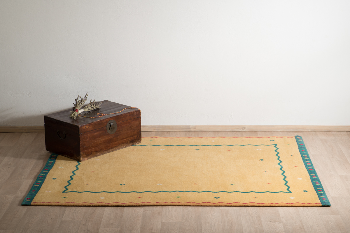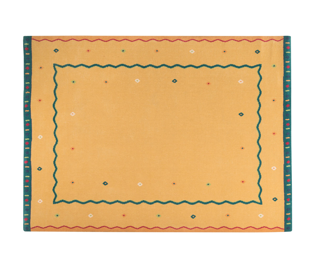 Μοντέρνο χαλί μηχανής από 100% μαλλί με βάση σε θερμό κίτρινο χρώμα και χαρούμενο διακριτικό σχέδιο από γεωμετρικά στοιχεία.