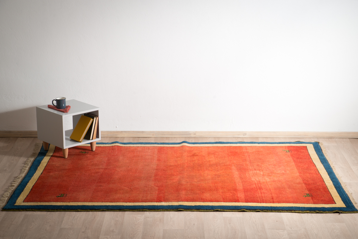 Ολόμαλλο ινδικό χειροποίητο χαλί σε μοντέρνο σχέδιο. Έχει πορτοκαλί βάση με διακριτικό σχέδιο και μπορντούρα σε αντίθεση.