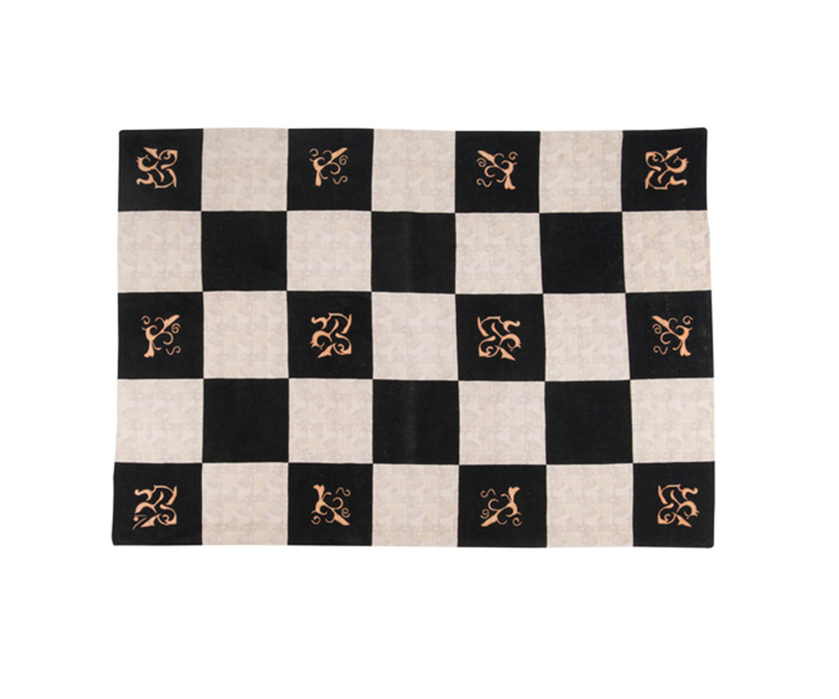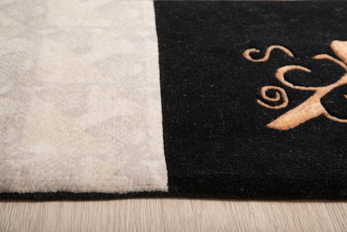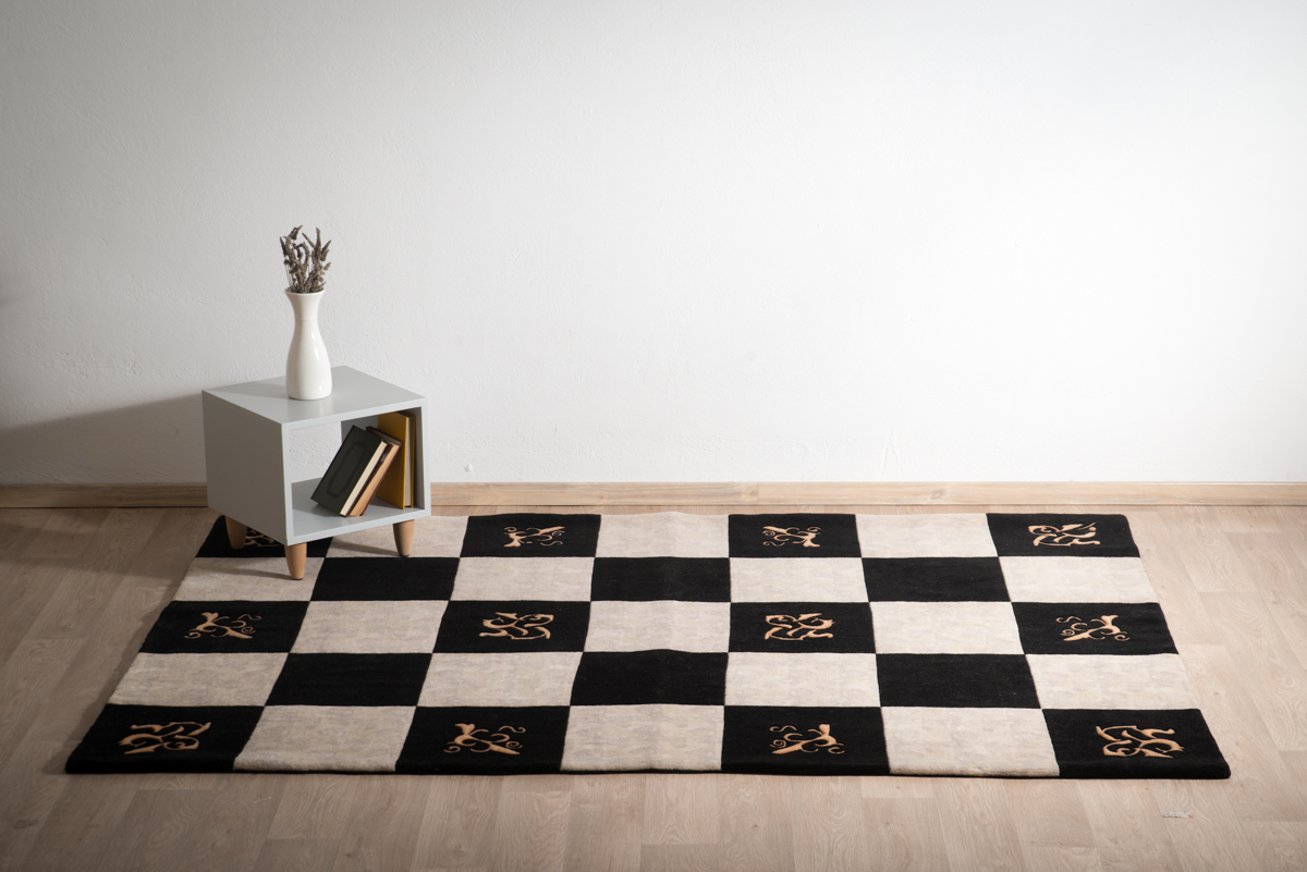 Ολόμαλλο χειροποίητο χαλί με αριστοκρατικές χρυσές λεπτομέρειες σε γεωμετρική ασπρόμαυρη βάση.