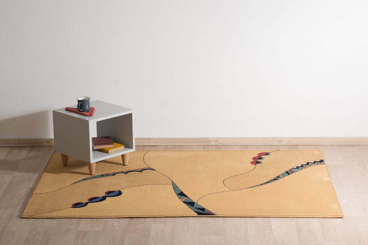 Μοντέρνο χαλί μηχανής σε μπεζ χρώμα με ιδιαίτερο γεωμετρικό σχέδιο σε αντίθεση.