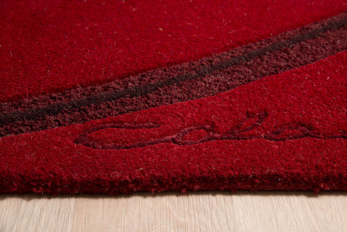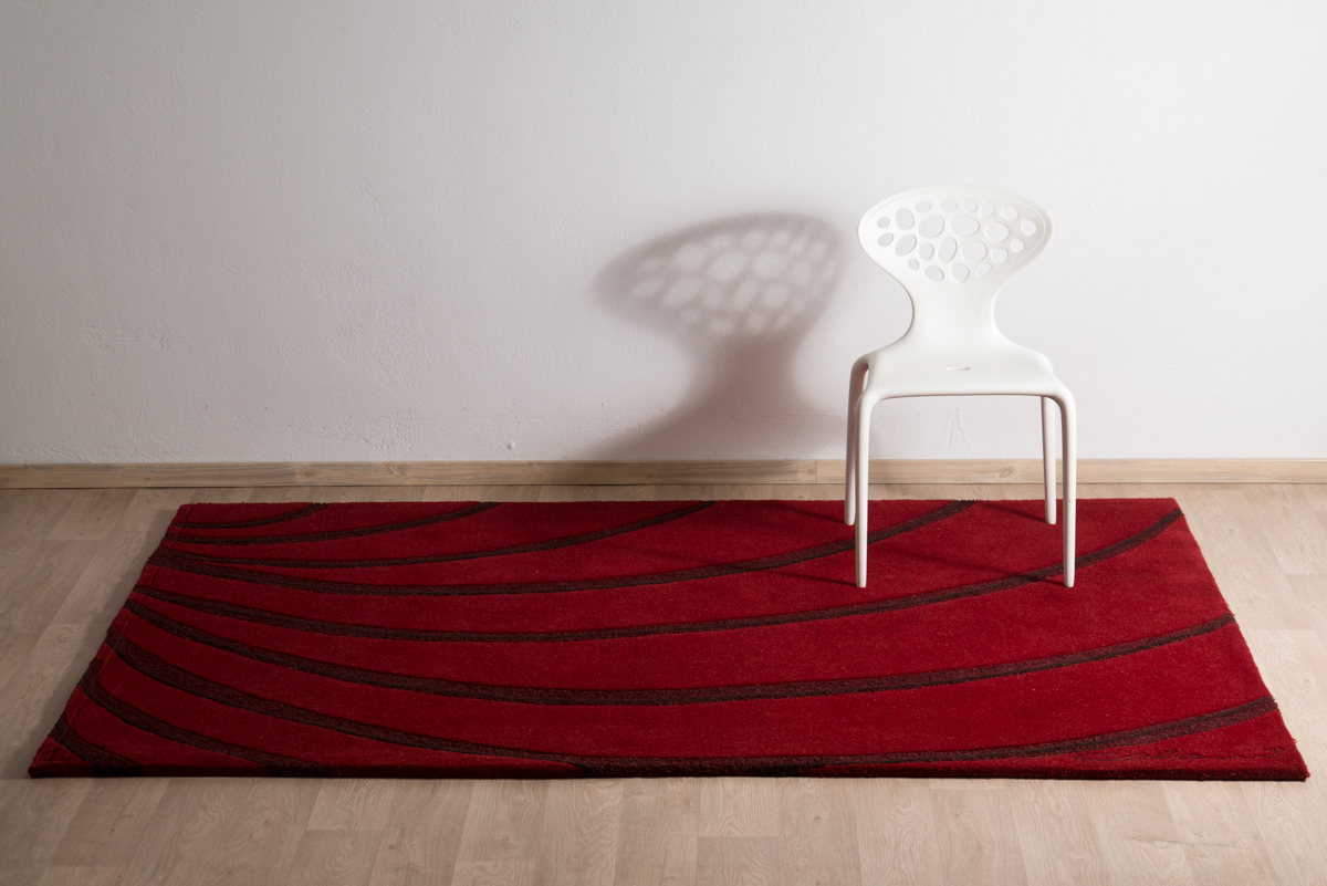 Χειροποίητο μοντέρνο χαλί με σύνθεση από 100% μαλλί με την υπογραφή του σχεδιαστή Colani. Έχει μπορντό βάση και ανάγλυφο γραμμικό σχέδιο σε αντίθεση.