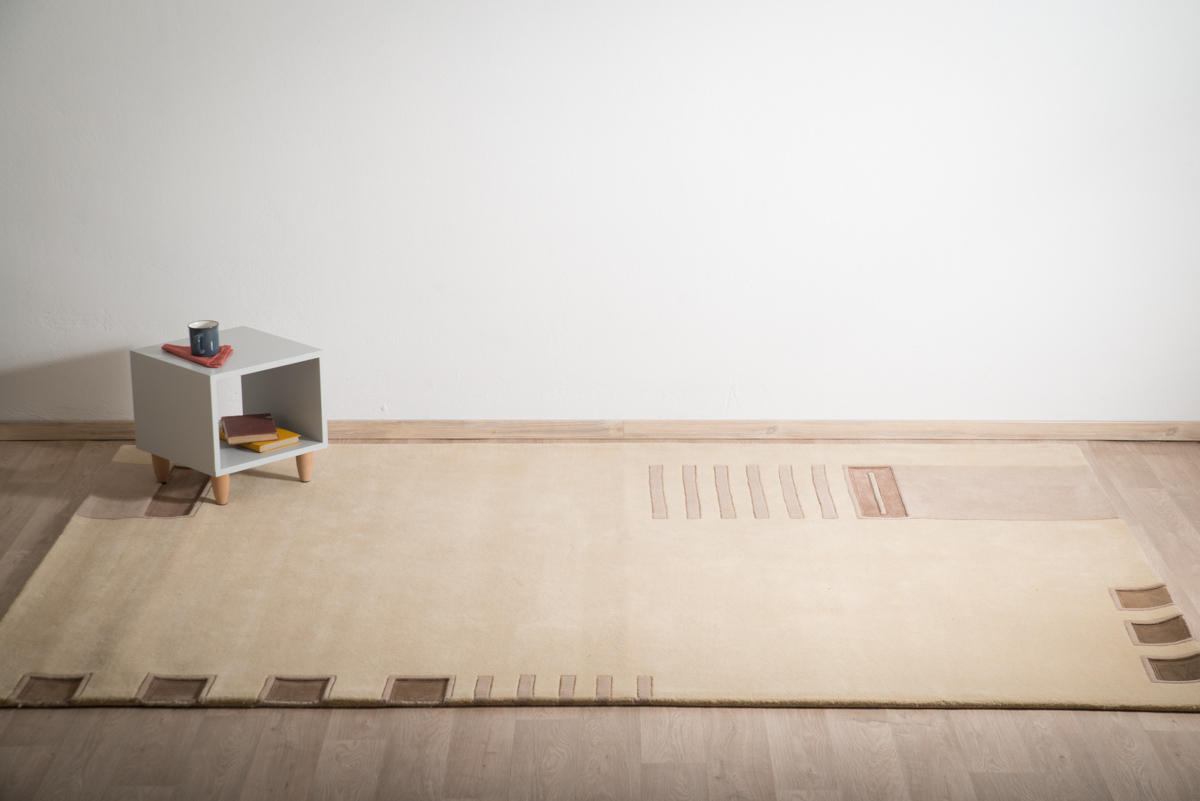 Μοντέρνο χαλί μηχανής σε μπεζ απόχρωση, με minimal σχέδιο από λωρίδες δέρματος σε αντίθεση και σύνθεση από 100% μαλλί.