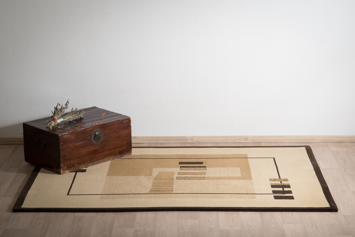 Σύμμεικτο μοντέρνο χαλί μηχανής σε γήινες αποχρώσεις με γεωμετρικό σχέδιο σε αντίθεση.