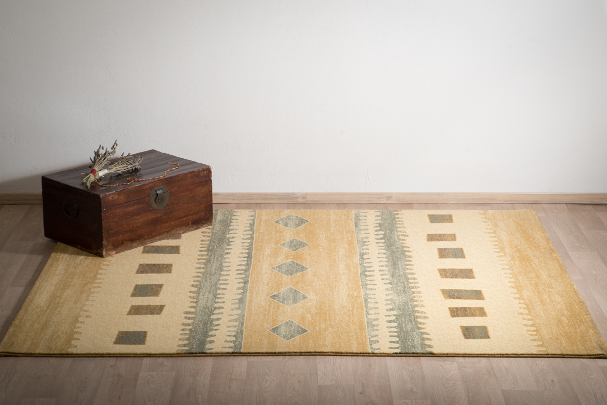 Σύμμεικτο μοντέρνο χαλί μηχανής σε γήινες αποχρώσεις με γεωμετρικό σχέδιο σε αντίθεση.