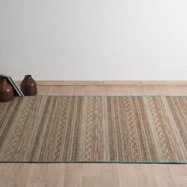 Σύμμεικτο μοντέρνο χαλί μηχανής σε κανελί βάση με διακριτικό γεωμετρικό σχέδιο σε αντίθεση.