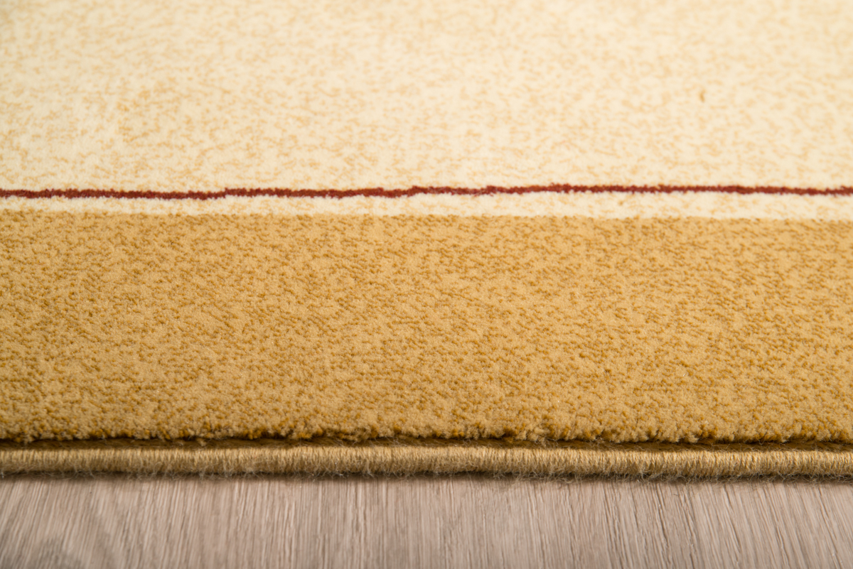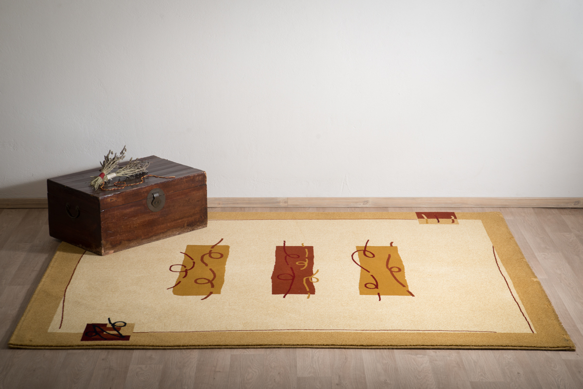 Σύμμεικτο μοντέρνο χαλί μηχανής με μπεζ βάση και αφηρημένο σχέδιο σε αντίθεση.