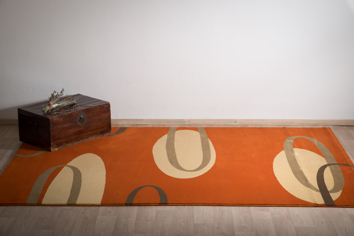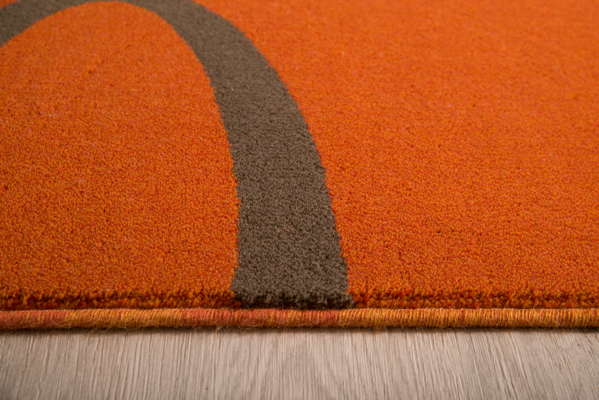 Σύμμεικτο μοντέρνο χαλί μηχανής με εντυπωσιακή πορτοκαλί βάση και αφηρημένο επαναλαμβανόμενο σχέδιο σε γήινες αποχρώσεις.