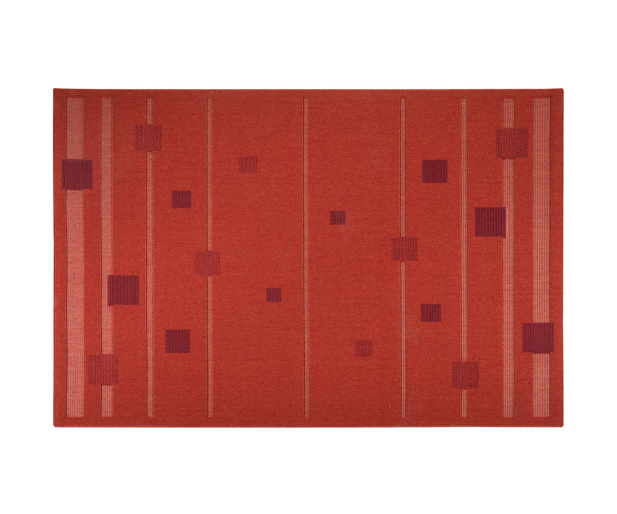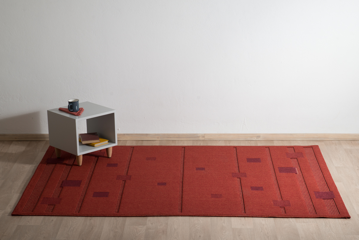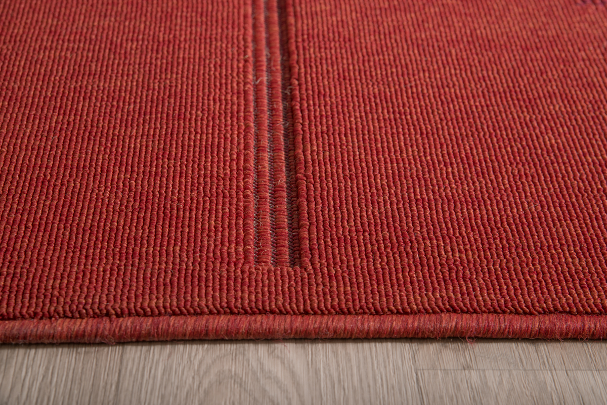 Χαλί μηχανής σε βαθιά κόκκινη απόχρωση με διακριτικό γεωμετρικό σχέδιο σε αντίθεση. Είναι συνθετικό και διαθέτει ανάγλυφη επιφάνεια που το καθιστά ιδιαίτερα ανθεκτικό στους λεκέδες και εύκολο στον καθαρισμό.
