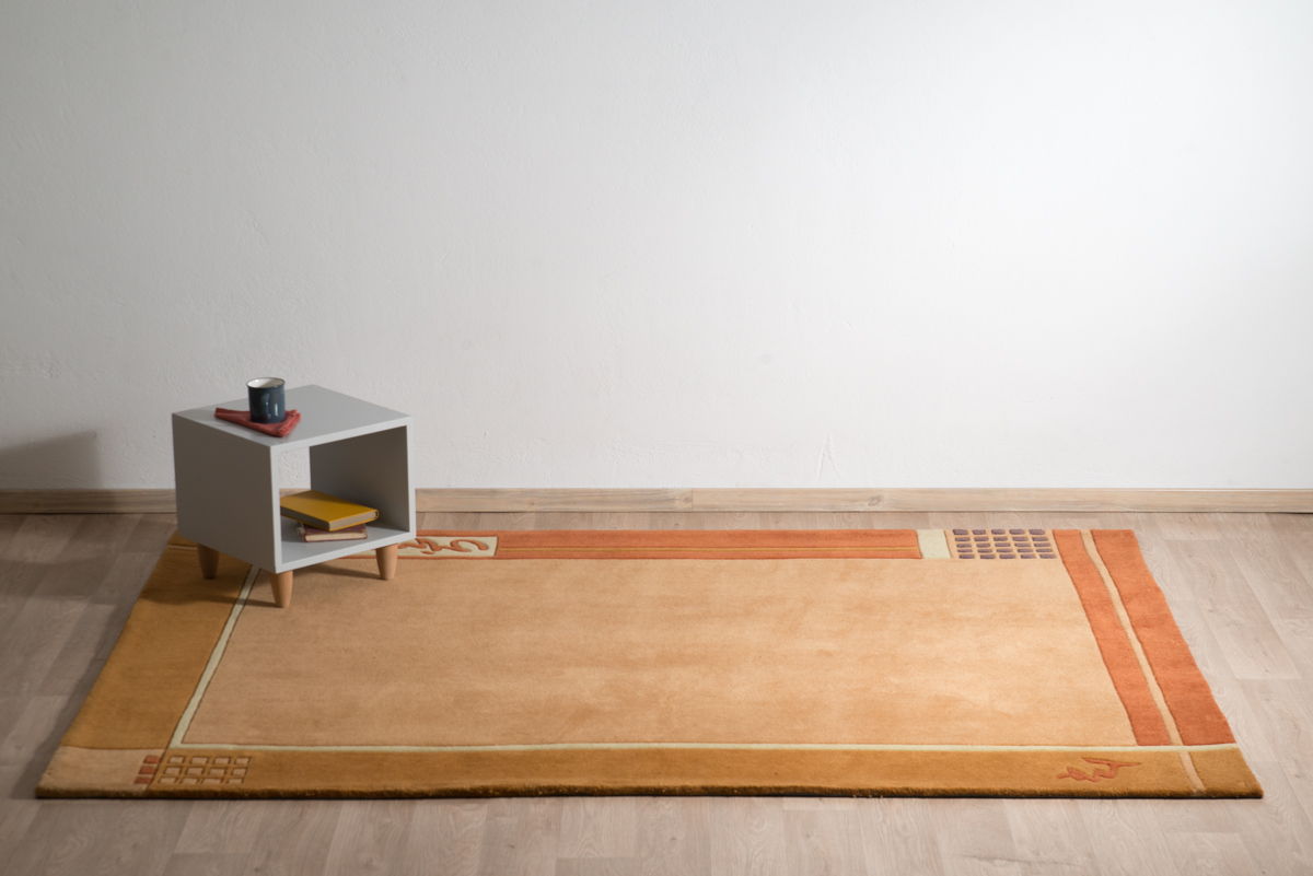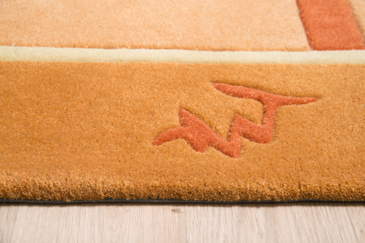 Μοντέρνο χαλί μηχανής σε ζωηρό πορτοκαλί χρώμα και μπορντούρα με διακριτικά σχέδια σε αντίθεση.