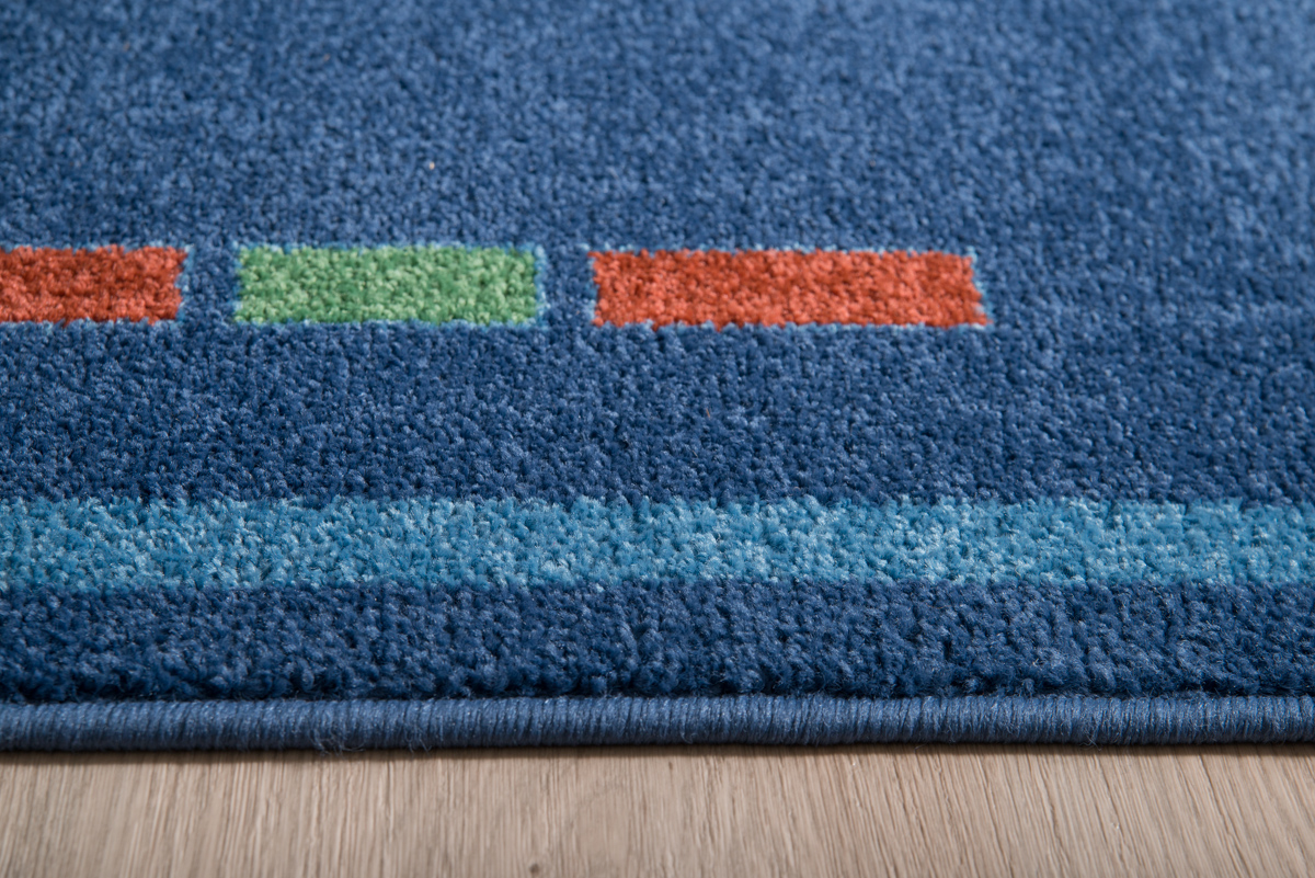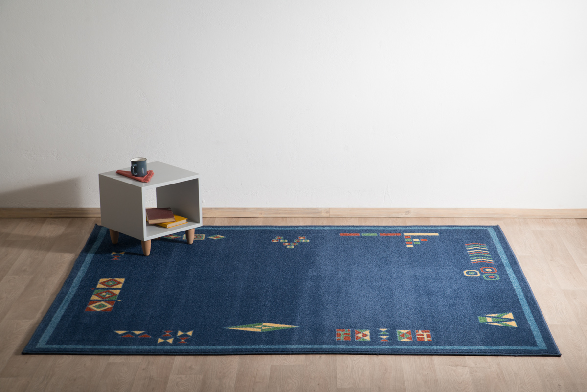 Συνθετικό χαλί μηχανής σε μπλε χρωματισμό και μπορντούρα σε διάφορα χρώματα. Ιδιαίτερα οικονομική λύση. Ιδανικό για φοιτητές.
