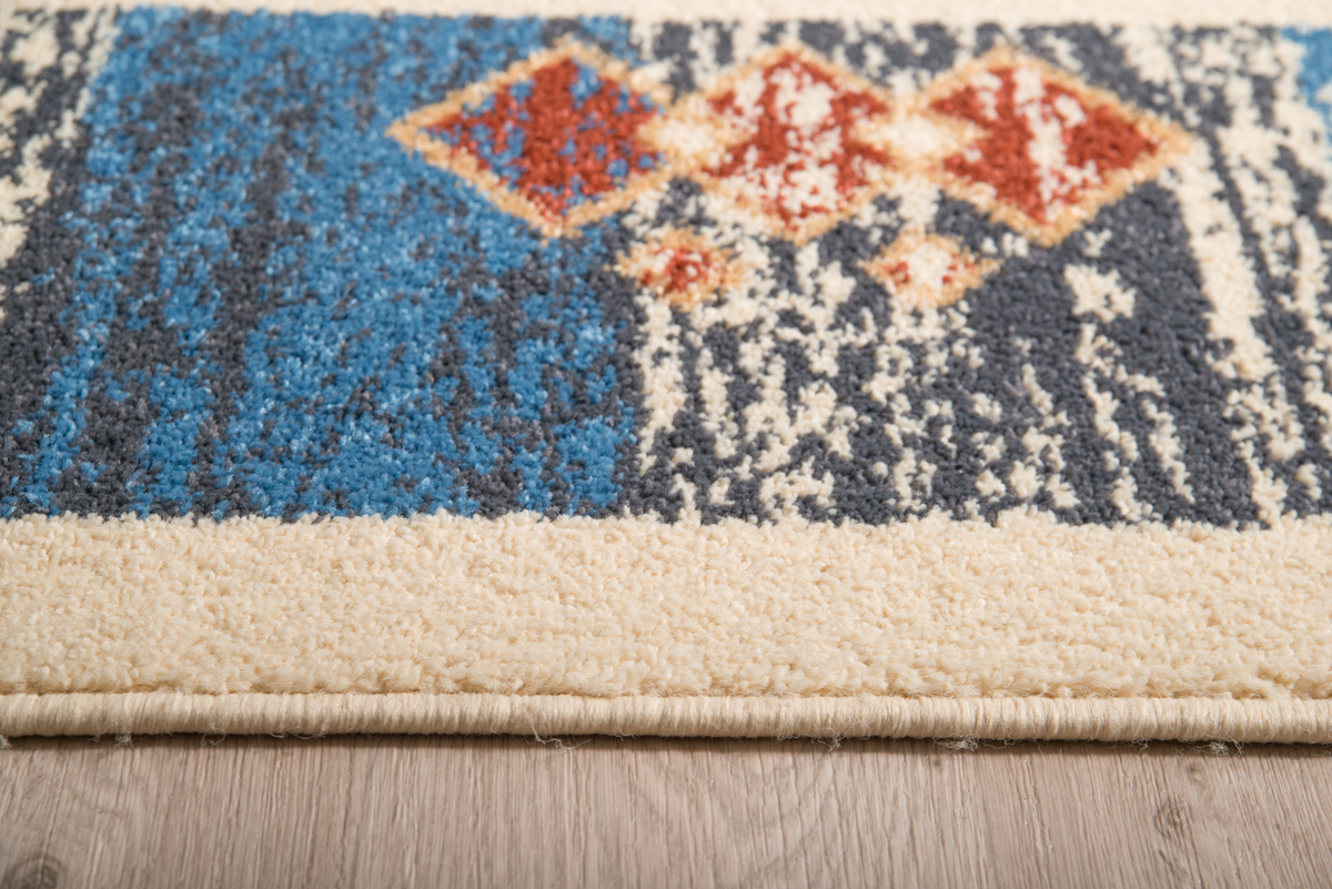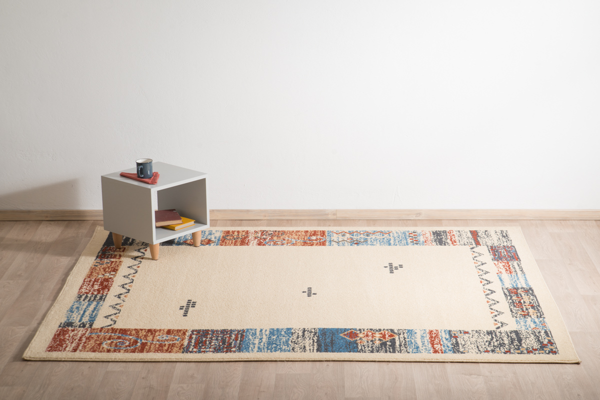 Συνθετικό χαλί μηχανής με μπεζ φόντο και πολύχρωμη μπορντούρα. Ιδιαίτερα οικονομική λύση. Ιδανικό για φοιτητές.