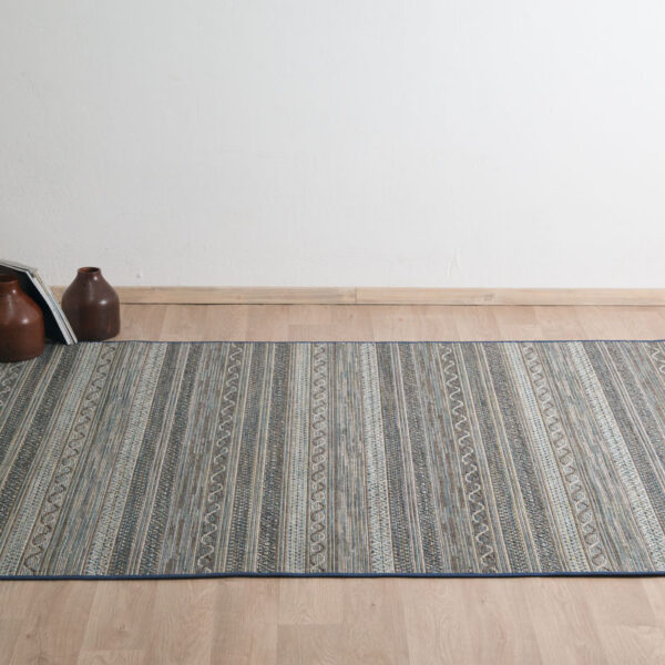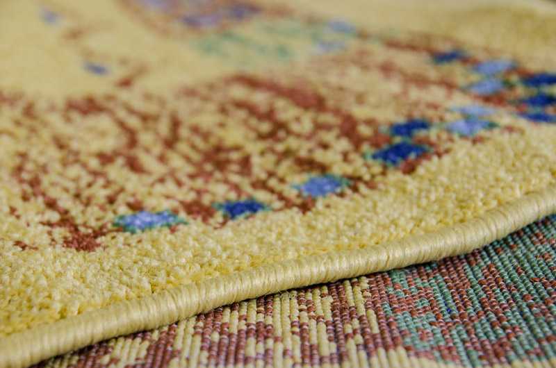 Συνθετικό χαλί μηχανής με κίτρινο φόντο και πολύχρωμη μπορντούρα. Ιδιαίτερα οικονομική λύση. Ιδανικό για φοιτητές.