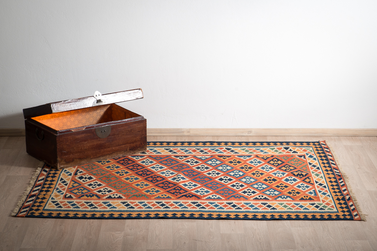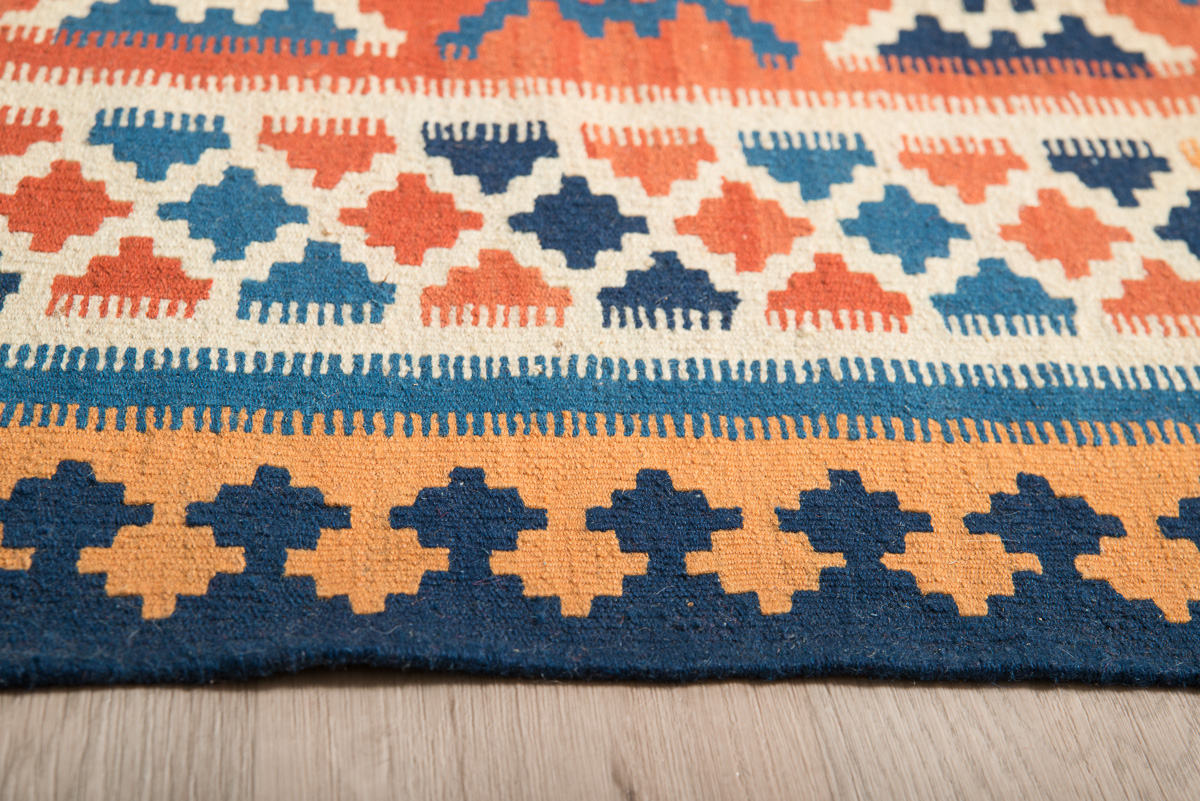 Χειροποίητο κιλίμι από 100% μαλλί σε μπλε και κεραμιδί χρωματισμούς με γεωμετρικά σχέδια.