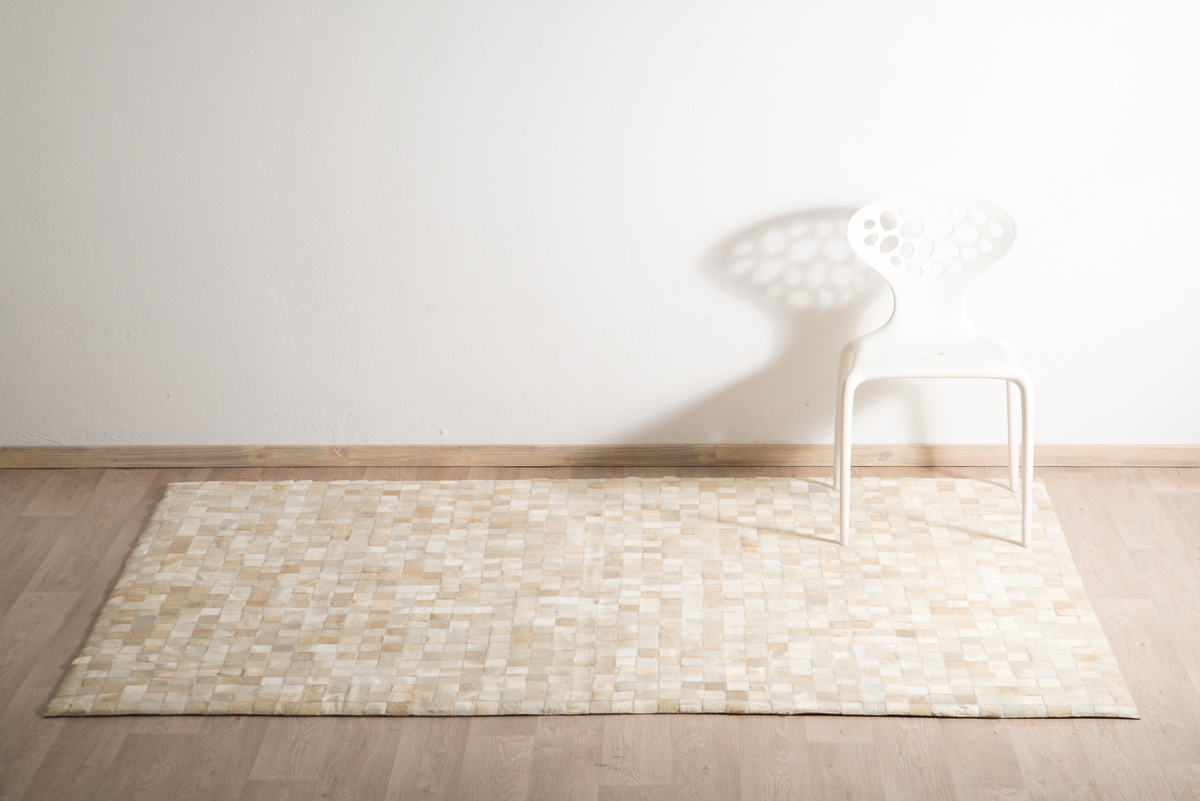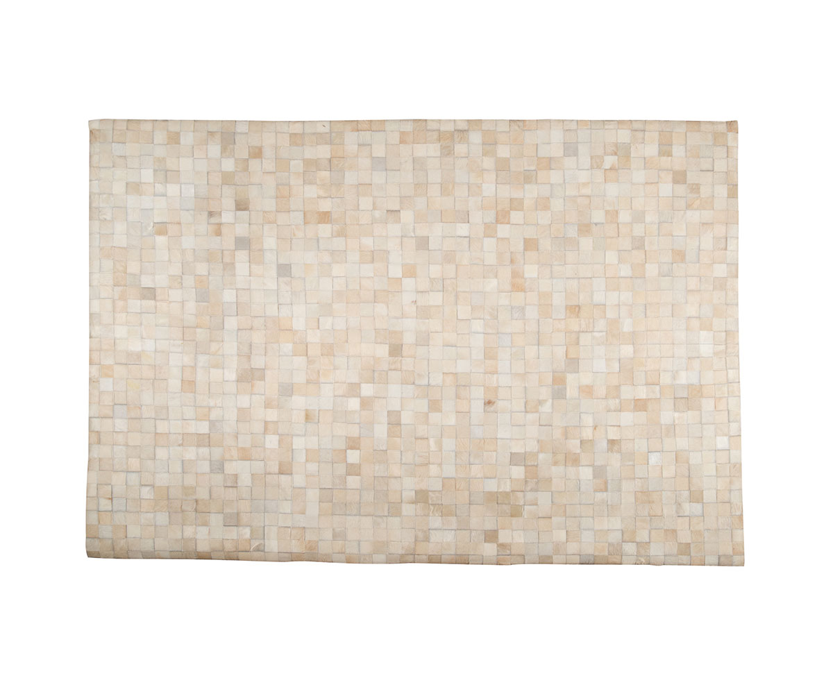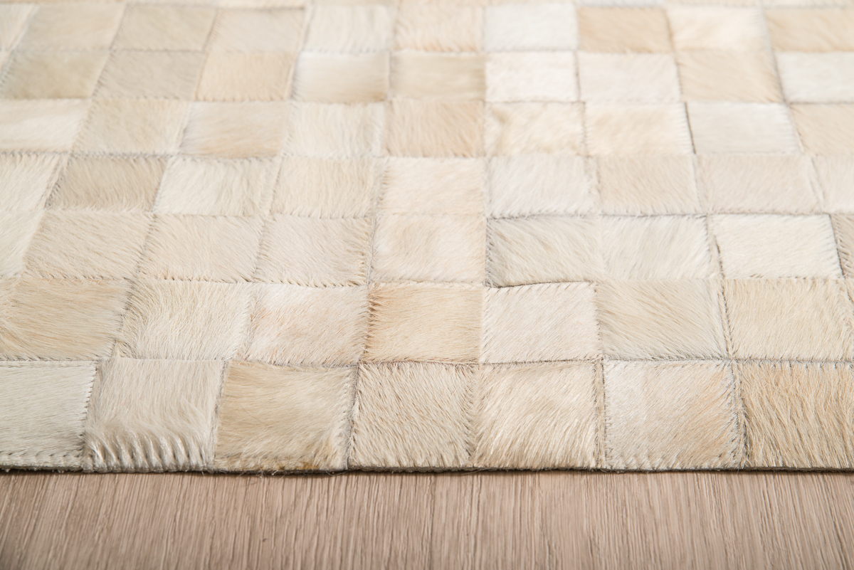 Μοντέρνο χειροποίητο δερμάτινο χαλί με αληθινό τρίχωμα αγελάδας σε εκρού αποχρώσεις με γεωμετρικό σχέδιο από τετραγωνάκια.