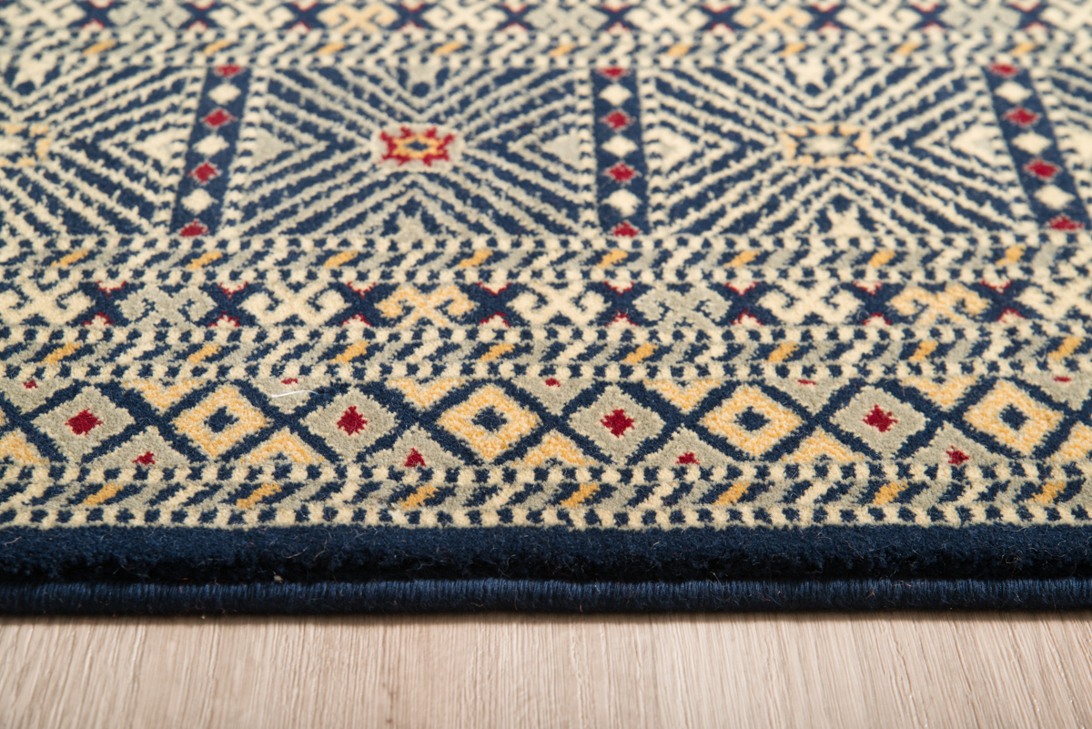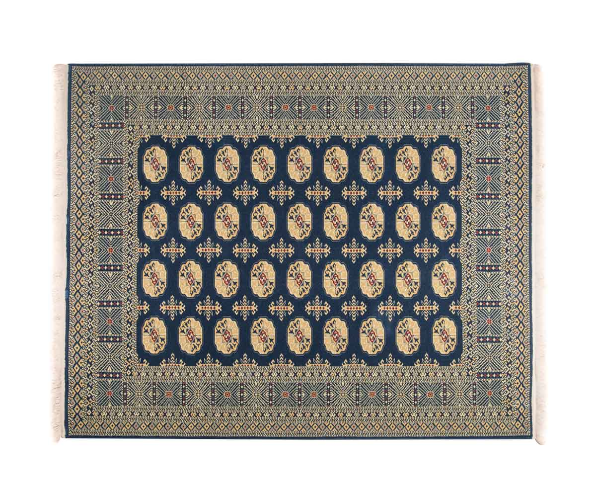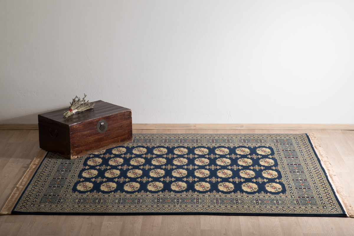 Ολόμαλλο χαλί μηχανής σε κλασικό σχέδιο μπουχάρα. Ιδιαίτερα πυκνή ύφανση. Η βάση του χρησιμοποιεί μπλε σκούρο χρώμα.