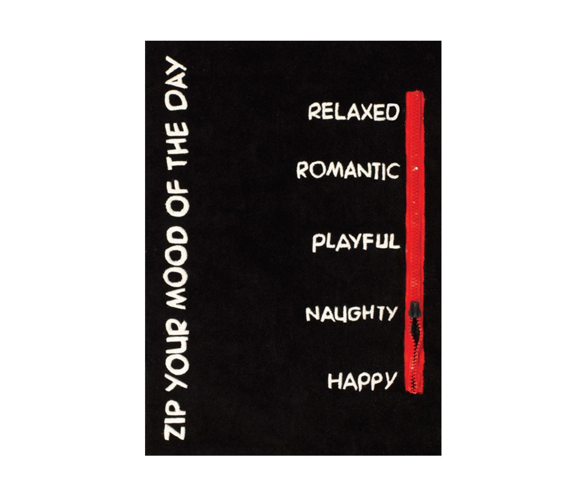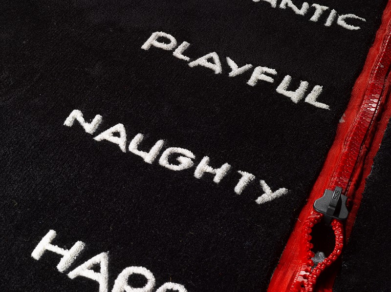 Μοντέρνο χαλί Mood 120×170 cm σε μαύρο χρώμα με λευκά γράμματα και φερμουάρ.