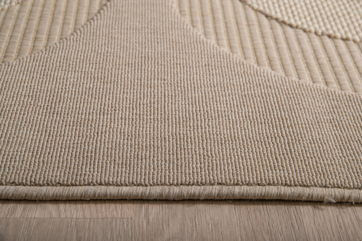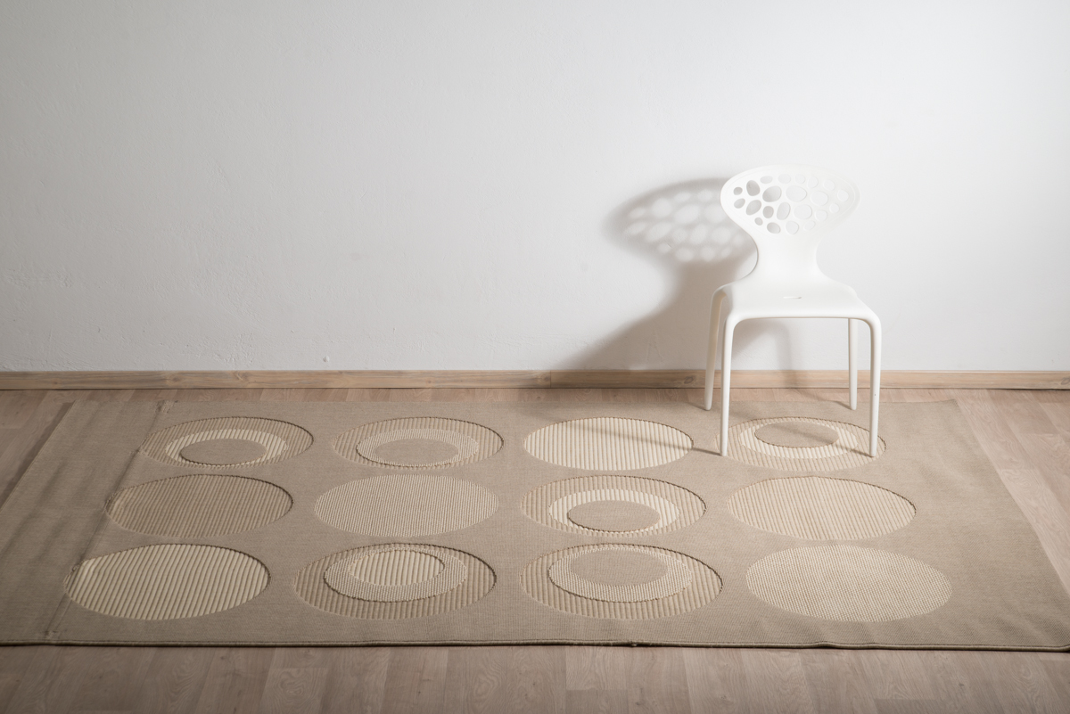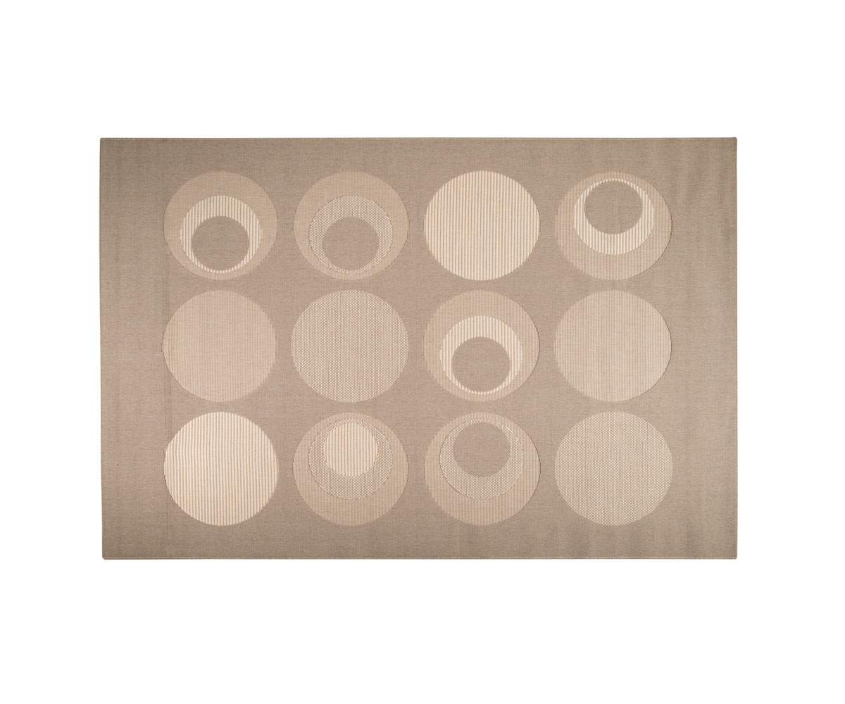 Χαλί μηχανής σε γήινες αποχρώσεις του γκρι με σχέδιο από επαναλαμβανόμενους κύκλους. Είναι συνθετικό και διαθέτει ανάγλυφη επιφάνεια που το καθιστά ιδιαίτερα ανθεκτικό στους λεκέδες.