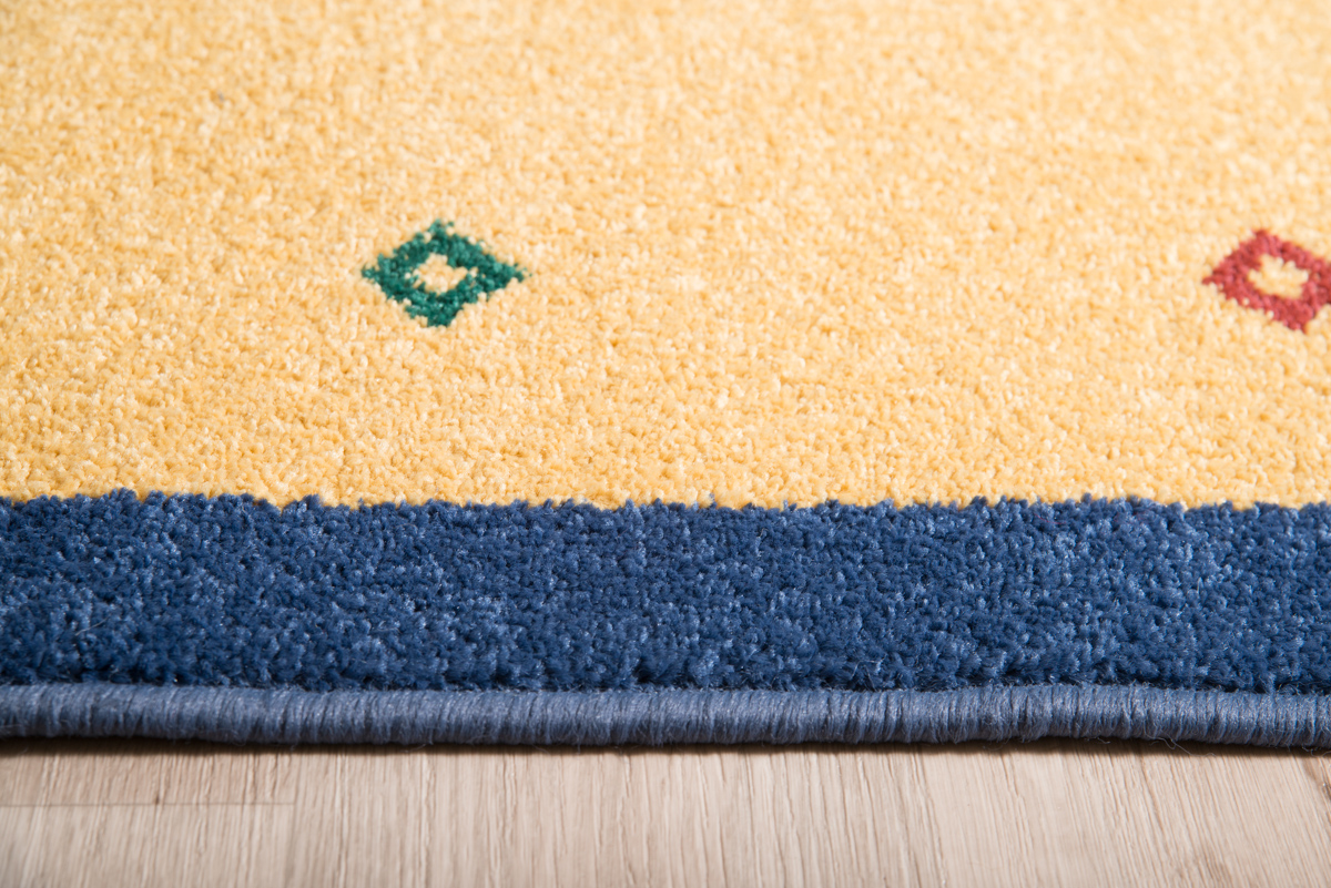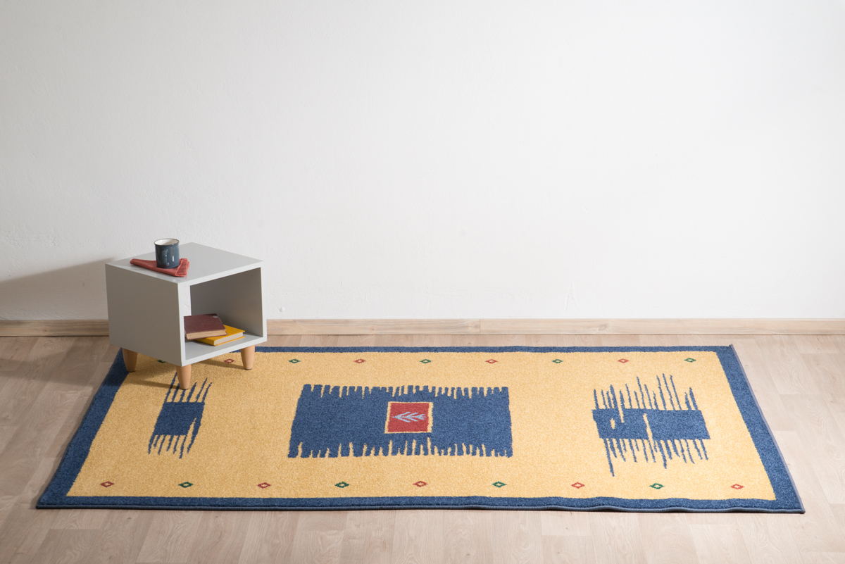 Συνθετικό χαλί μηχανής σε κίτρινο χρωματισμό και μπλε σχέδιο στο κέντρο, Ιδιαίτερα οικονομική λύση. Ιδανικό για φοιτητές.